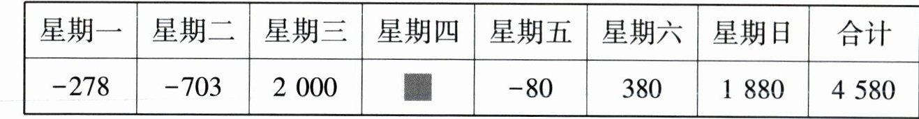 (1)根据表格可知,星期四的盈亏数为$ 4580-(-278)-(-703)-2000-(-80)-380-1880=1381 $(元).因为1381是正数,所以星期四是盈利,盈利1381元;