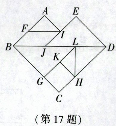 17. 新趋势数学文化《冷庐杂识》有云:“近又有七巧图,其式五,其数七,其变化之式多至千余.”七巧板作为中国古老的益智玩具之一,已有千年的历史,素有“来自中国的拼图”“东方魔板”之称,是世界公认的中国优秀智力玩具代表作.如图,小明拼凑出爱心形状,若爱心的面积为48,那么七巧板中正方形GKHC的面积为____.