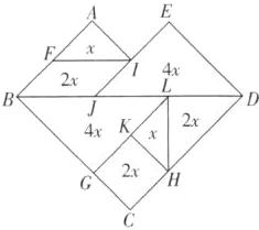 6 【解析】设$\triangle KLH$的面积为x,结合七巧板的性质得各个面积的情况如图所示,依题意,$4x+4x+2x+2x+2x+x+x=16x=48$,解得$x=3$,所以正方形GKHC的面积为$3×2=6$.