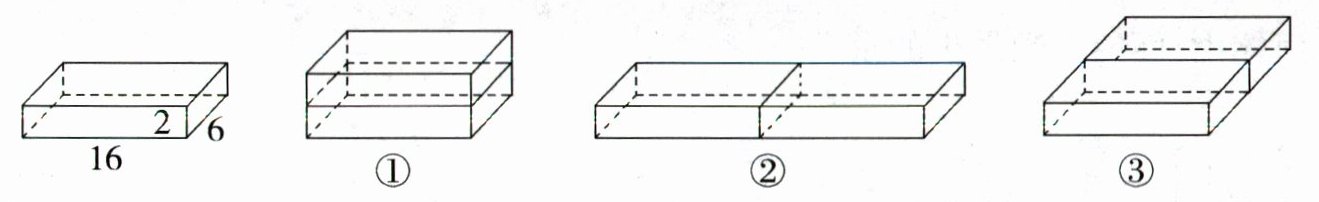 实践操作:我们发现,无论怎样放置这两个长方体纸盒,搭成的大长方体体积都不变,但是由于摆放位置的不同,它们的表面积会发生变化,经过操作,发现共有3种不同的摆放方式,如图所示: