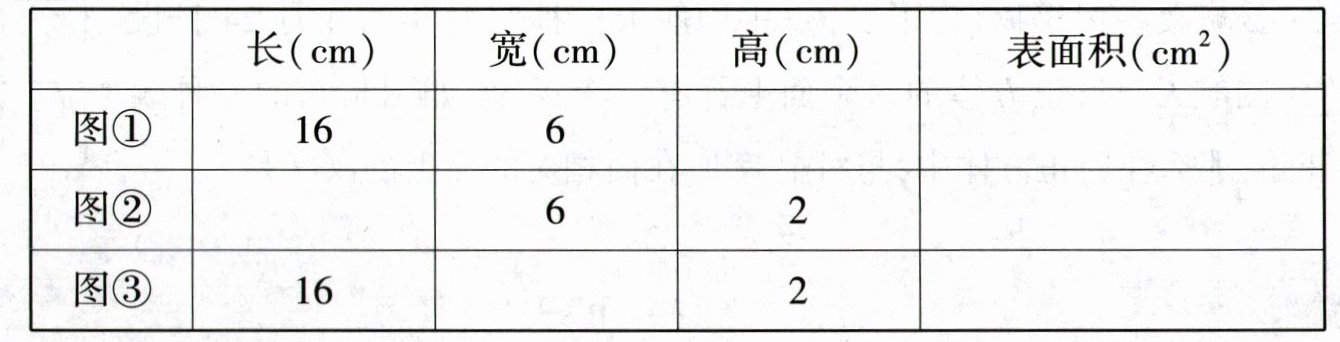 (1)如表:长(cm) 宽(cm) 高(cm) 表面积($\text{cm}^2$)图① 16 6 4 368图② 32 6 2 536图③ 16 12 2 496 根据上表可知,表面积最小的是图①所示的长方体.