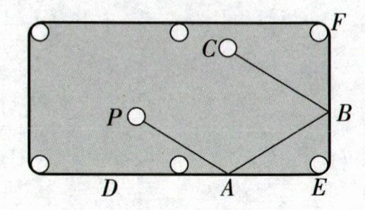 14. (8 分)如图,台球运动中母球 $ P $ 击中桌边的点 $ A $,经桌边反弹后击中相邻的另一桌边的点 $ B $,再次反弹经过点 $ C $(提示: $ \angle PAD = \angle BAE, \angle ABE = \angle CBF $).