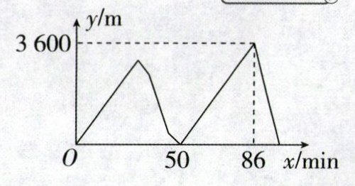 ∴甲出发86min时,甲、乙两人之间的距离达到最大值3600m,结论②正确;③设甲的速度为x m/min,乙的速度为y m/min,根据题意,得$\begin{cases}(50 - 10)x = (50 - 30)y\\(86 - 30)y - (86 - 10)x = 3600\end{cases}$,解得$\begin{cases}x = 100\\y = 200\end{cases}$,