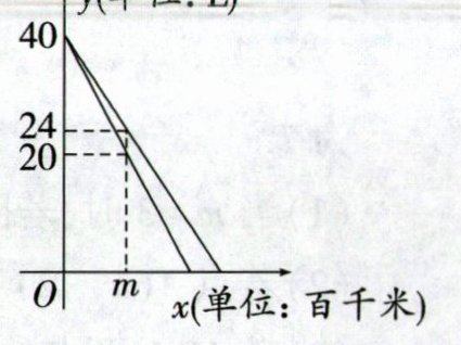 B [解析]由图象知甲、乙两车行驶m千米时,甲车耗油40 - 24 = 16(L),乙车耗油40 - 20 = 20(L),由题意得$\frac{20}{m}-\frac{16}{m}=2$.故选B.