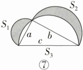 ②如图⑦,分别以直角三角形三边为直径作半圆,设图中两个月形图案(图中阴影部分)的面积分别为$S_{1},S_{2}$,直角三角形的面积为$S_{3}$,请判断$S_{1},S_{2},S_{3}$的关系并证明.
