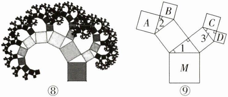 (3)如果以正方形的一边为斜边向外作直角三角形,再以该直角三角形的两直角边分别向外作正方形,重复这一过程就可以得到如图⑧所示的“勾股树”.在如图⑨所示的“勾股树”的某部分图形中,设大正方形M的边长为定值m,四个小正方形A,B,C,D的边长分别为a,b,c,d,已知∠1= ∠2= ∠3= α,则当∠α变化时,$a^{2}+b^{2}+c^{2}+d^{2}= $______.(结果可用含m的式子表示)