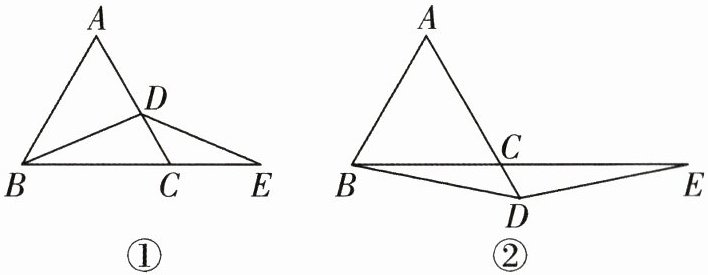 (1)如图①,若点$D在边AC$上,猜想线段$AD与CE$之间的数量关系,并说明理由;