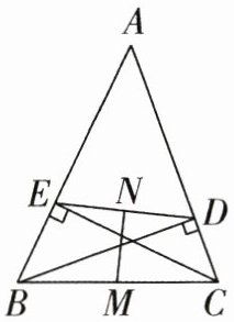 (1)如图,连接EM,DM,$\because BD\perp AC$,$CE\perp AB$,$\therefore \angle BDC=\angle BEC=90^{\circ}$.$\because$ 在$\text{Rt}\triangle DBC$和$\text{Rt}\triangle EBC$中,M是斜边BC的中点,$\therefore DM=\frac{1}{2}BC$,$EM=\frac{1}{2}BC$,$\therefore DM=EM$.$\because N$是DE的中点,$\therefore MN\perp DE$.