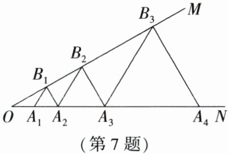 7. 如图,已知 $ \angle MON= 30^{\circ} $, 点 $ A_1,A_2,A_3 … $ 在射线 $ ON $ 上, 点 $ B_1,B_2,B_3 … $ 在射线 $ OM $ 上, $ \triangle A_1 B_1 A_2 $, $ \triangle A_2 B_2 A_3, \triangle A_3 B_3 A_4 … $ 均为等边三角形, 若 $ OA_1= 4 $, 则 $ \triangle A_6 B_6 A_7 $ 的边长为 ( )