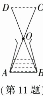 11. 数学课上老师布置了“测量锥形瓶内部底面的直径”的探究任务, 小聪想到老师讲过“利用全等三角形对应边相等, 可以把不能直接测量的物体‘移’到可以直接测量的位置测量”于是他设计了如下方案: 如图, 用螺丝钉将两根小棒 $ AC,BD $ 的中点 $ O $ 固定, 测得 $ CD= 8 \mathrm{~cm} $, 就可知道内径 $ AB $ 的长度是