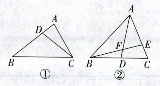 (2)如图②,在$△ABC$中,$AB > AC$,$AD平分∠BAC$,$E为AC$边上任意一点(不与点$A$,点$C$重合),连接$BE$,交$AD于点F$.求证:$BF > FE$.