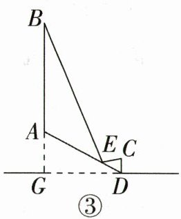 小军和小明讨论后,发现用此方法也可测量出斜坡上信号塔AB的高度.他们给出了如下测量步骤(如图③):①让小军站在斜坡的底端D处不动(小军眼睛离地面距离$CD= 1.7m$),小明通过移动镜子(镜子平放在坡面上)位置至E处,让小军恰好能看到塔顶B;②测出$DE= 2.8m$;③测出坡长$AD= 17m$;④测出坡比为$8:15$(即$tan∠ADG= \frac {8}{15}$).通过他们给出的方案,请你算出信号塔AB的高度.(结果保留整数)