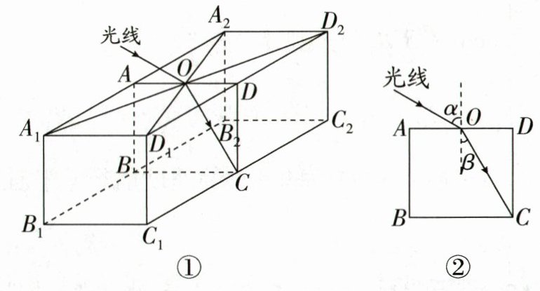 (2)现有一块与(1)中折射率相同的长方体介质,如图①所示,点A、B、C、D分别是长方体棱的中点,若光线经真空从矩形$A_{1}D_{1}D_{2}A_{2}$对角线交点O处射入,其折射光线恰好从点C处射出,如图②,已知$α = 60^{\circ}$,$CD = 10cm$,求截面ABCD的面积.