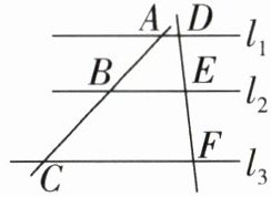 1.(成都中考)如图,直线$ l _ { 1 } // l _ { 2 } // l _ { 3 } $,直线$ AC 和 DF 被 l _ { 1 } $、$ l _ { 2 } $、$ l _ { 3 } $所截,$ AB = 5 $,$ BC = 6 $,$ EF = 4 $,则$ DE $的长为 (