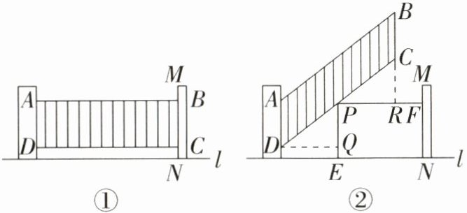 22.(8分)如图为某小区入口处安装的汽车出入道闸示意图.如图①,道闸关闭时,四边形$ A B C D $是矩形,且$ B C 落在 M N $上.如图②,在道闸打开的过程中,边$ A D $固定,$ A D \perp 直线 l $,连杆$ A B $、$ C D 分别绕点 A $、$ D $转动,且边$ B C 始终与边 A D $平行,$ P 为 C D $上的一点(不与点$ C $、$ D $重合),过点$ P 作 P E \perp l $,$ P F \perp M N $,垂足分别为$ E $、$ F $,即四边形$ P E N F $是矩形,过点$ D 作 D Q \perp P E $,垂足为$ Q $,延长$ B C 与 P F 相交于点 R $.