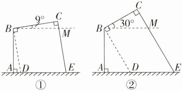 20. (10分)(2024·遂宁中考)小明的书桌上有一个L型台灯,灯柱$AB$高40 cm,他发现当灯带$BC与水平线BM的夹角为9^{\circ}$时(图①),灯带的直射宽$DE(BD\perp BC,CE\perp BC)$为35 cm,但此时灯的直射宽度不够,当他把灯带调整到与水平线的夹角为$30^{\circ}$时(图②),直射宽度刚好合适,求此时台灯最高点$C$到桌面的距离.(结果保留一位小数)($\sin 9^{\circ}\approx 0.16,\cos 9^{\circ}\approx 0.99,\tan 9^{\circ}\approx 0.16$)
