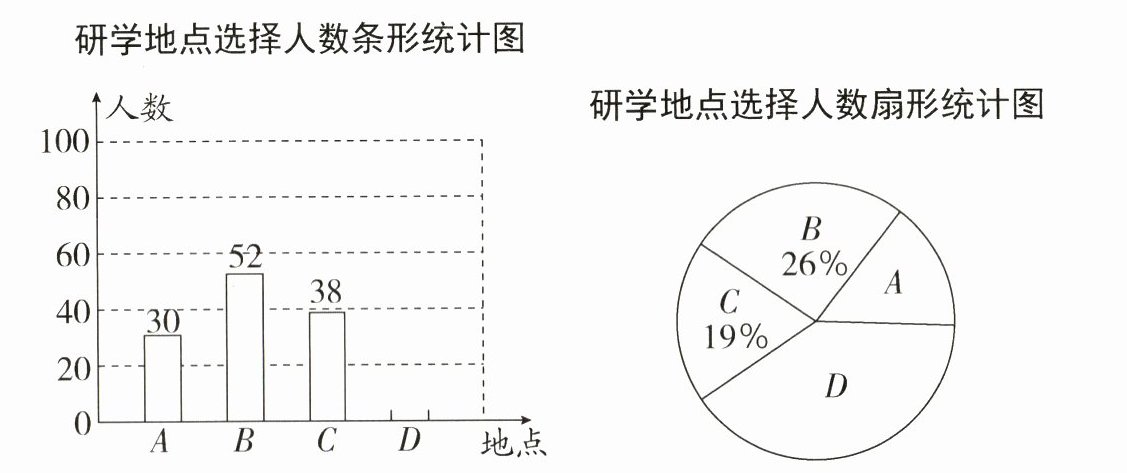 (1) 研学地点选择人数条形统计图 54 [解析]总人数:$52÷26\% = 200$(人),A所对应的圆心角的度数为$360^{\circ}×\frac{30}{200}=54^{\circ}$;D组人数:$200 - 30 - 52 - 38 = 80$(人).