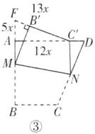 ∴ 在Rt△B'FM中,FM = $\frac{13}{5}$(8 - 13x),B'M = MB = $\frac{12}{5}$(8 - 13x),则5x + $\frac{12}{5}$(8 - 13x) + $\frac{13}{5}$(8 - 13x) = 12,解得x = $\frac{7}{15}$,AC' = 12x = $\frac{28}{5}$.如图③,当点F在BA的延长线上时,同上tan∠AFC' = $\frac{12}{5}$,在Rt△AFC'中,设AF = 5x,AC' = 12x,FC' = 13x,FB' = 13x - 8,在Rt△MFB'中,FM = $\frac{13}{5}$(13x - 8),B'M = MB = $\frac{12}{5}$(13x - 8),则FB = 5x + 12 = $\frac{12}{5}$(13x - 8) + $\frac{13}{5}$(13x - 8),解得x = $\frac{13}{15}$,则AC' = 12x = 12×$\frac{13}{15}$ = $\frac{52}{5}$.综上,AC'的长为$\frac{28}{5}$或$\frac{52}{5}$.