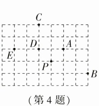 4.D [解析]如图,设每个小正方形的边长为1,由勾股定理得$PC=PE=PB=\sqrt{10}$,$\therefore$点P到B、C、E三点的距离相等,$\therefore$点P 是$\triangle BCE$的外心。故选D.