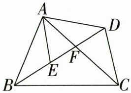 22. (8 分) 如图,在四边形 $ A B C D $ 中,$ A C $、$ B D $ 相交于点 $ F $,点 $ E $ 在 $ B D $ 上,且 $ \frac { A B } { A E } = \frac { B C } { E D } = \frac { A C } { A D } $.