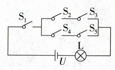 22. (10 分)小明在学完物理“电学”知识后,进行“灯泡亮了”的实验,设计了如图所示的电路图,电路图上有 5 个开关 $S_{1}$、$S_{2}$、$S_{3}$、$S_{4}$、$S_{5}$ 和一个小灯泡,当开关 $S_{1}$ 闭合时,再同时闭合开关 $S_{2}$、$S_{3}$ 或 $S_{4}$、$S_{5}$ 都可以使小灯泡发亮.