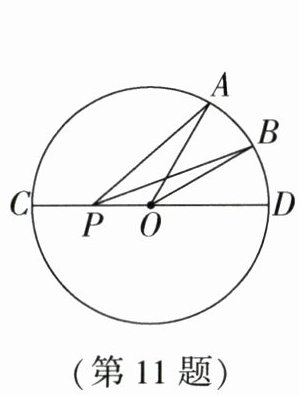 11. 如图,$\odot O的直径CD$为6 cm,$OA$、$OB都是\odot O$的半径,$\angle AOD = 2\angle AOB = 60^{\circ}$,点$P在直径CD$上移动,则$AP + BP$的最小值为____cm.