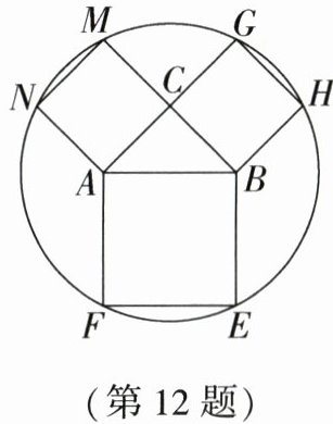 12. (金华中考)如图,在$Rt\triangle ABC$中,$\angle ACB = 90^{\circ}$,以该三角形的三条边为边向外作正方形,正方形的顶点$E$、$F$、$G$、$H$、$M$、$N$都在同一个圆上.记该圆面积为$S_{1}$,$\triangle ABC的面积为S_{2}$,则$\frac{S_{1}}{S_{2}}$的值是____.