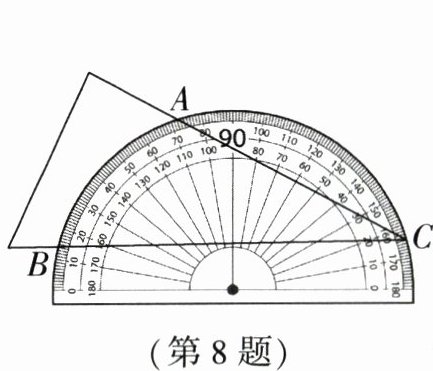 8. (2024·东莞模拟)学了圆后,小亮突发奇想,想到用这种方法测量三角形的角度:将三角形纸片如图放置,使得顶点$C$在量角器的半圆上,纸片另外两边分别与量角器的半圆交于$A$,$B$两点.点$A$,$B在量角器半圆上对应的读数分别是72^{\circ}$,$14^{\circ}$,这样小明就能得到$\angle C$的度数,请你帮忙算算$\angle C$的度数是____.
