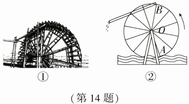 14. (2024·济南模拟)如图①,我国是世界上最早制造使用水车的国家.如图②是水车舀水灌溉示意图,水车轮的辐条(圆的半径)$OA$ 长约为 $6$ 米,辐条尽头装有刮板,刮板间安装有等距斜挂的长方体形状的水斗,当水流冲动水车轮刮板时,驱使水车徐徐转动,水斗依次舀满河水在点 $A$ 处离开水面,逆时针旋转 $150 ^ { \circ }$ 上升至轮子上方 $B$ 处,斗口开始翻转向下,将水倾入木槽,由木槽导入水渠,进而灌溉,那么水斗从 $A$ 处(舀水)转动到 $B$ 处(倒水)所经过的路程是______米.(结果保留 $\pi$)