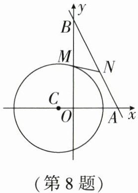 8. (2024·惠州模拟)如图,在平面直角坐标系 $x O y$ 中,直线 $AB$ 与 $x$ 轴交于点 $A ( 3,0 )$,与 $y$ 轴交于点 $B$,$O B = 2 O A$,点 $M$ 在以点 $C ( - 1,0 )$ 为圆心,$3$ 为半径的圆上,点 $N$ 在直线 $AB$ 上,若 $MN$ 是 $\odot O$ 的切线,则 $M N ^ { 2 }$ 的最小值为 ( )
