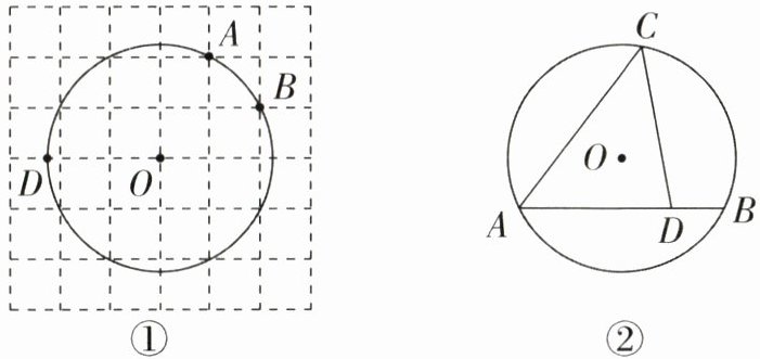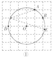 (1)在图①所示的小正方形网格中,每个小正方形的顶点叫做格点,点 $A$、$B$、$O$ 是格点,$\odot O$ 经过 $A$、$B$ 两点,点 $D$ 是 $\odot O$ 与格线的交点,在优弧 $\overgroup { B D }$ 上作点 $E$,使得 $\overgroup { B E } = \overgroup { A B }$;
