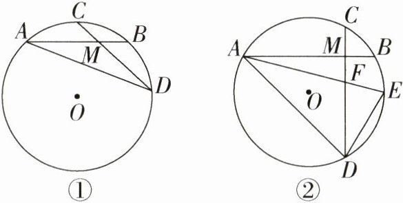 (2)如图②,若 $A B \perp C D$,在 $\overgroup { B D }$ 上取一点 $E$,使 $\overgroup { B E } = \overgroup { B C }$,$A E$ 交 $C D$ 于点 $F$,连接 $AD$、$DE$.