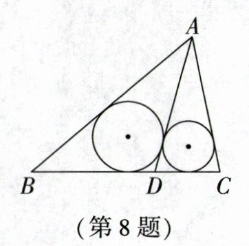 8. (德阳中考)如图,在$ \triangle ABC $中,$ AB = 3 $,$ AC = 2.25 $,点$D是BC$边上的一点,$AD = BD = 2DC$,设$ \triangle ABD 与 \triangle ACD 的内切圆半径分别为 r_{1} $、$ r_{2} $,那么$ \frac{r_{1}}{r_{2}} = $ (