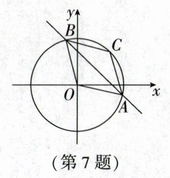 7. 如图,在平面直角坐标系中,以原点$O$为圆心,6为半径的$ \odot O 与直线 y = -x + b(b > 0) 交于A$、$B$两点,连接$OA$、$OB$,以$OA$、$OB为邻边作平行四边形OACB$,若点$C恰好在 \odot O $上,则$b$的值为 (