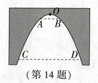 14. (2024·松原模拟)如图为一座拱桥的部分示意图,中间桥洞的边界线是抛物线形,涝季的最高水位线在 $ AB $ 处,此时桥洞中水面宽度 $ AB $ 仅为4米,桥洞顶部点 $ O $ 到水面 $ AB $ 的距离仅为1米;旱季最低水位线在 $ CD $ 处,此时桥洞中水面宽度 $ CD $ 达12米,那么最低水位 $ CD $ 与最高水位 $ AB $ 之间的距离为
