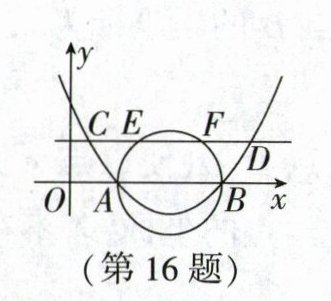 16. 如图,抛物线过点 $ A(2,0) $、$ B(6,0) $、$ C(1,\sqrt{3}) $,平行于 $ x $ 轴的直线 $ CD $ 交抛物线于点 $ C、D $,以 $ AB $ 为直径的圆交直线 $ CD $ 于点 $ E、F $,则 $ CE + FD $ 的值是