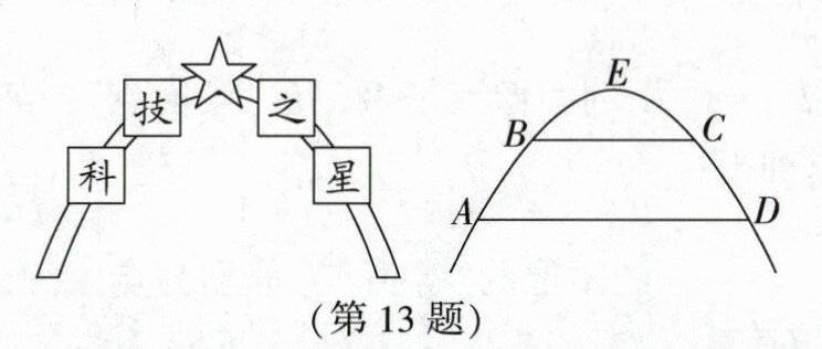 13.(2024·达州模拟)某校计划举办科技节颁奖典礼,想在颁奖现场设计一个抛物线形拱门入口.如图,要在拱门上顺次粘贴“科”“技”“之”“星”(分别记作点A、B、C、D)四个大字,要求$BC// AD$,最高点的五角星(点E)到BC的距离为0.5米,$BC= 2$米,$AD= 4$米,则点C到AD的距离为____