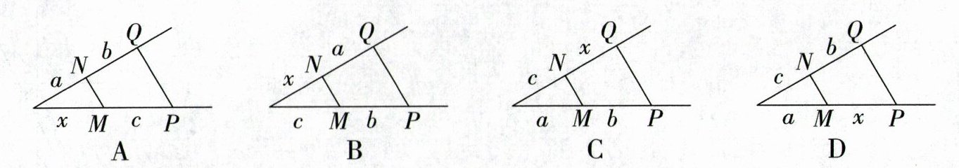 1. 已知 $ MN // PQ $, $ a \neq b $, $ c \neq x $, 则满足关系式 $ \frac{a}{b} = \frac{c}{x} $ 的图形是 (