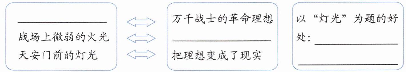 书上插图中的灯光 郝副营长舍身为部队引路的伟大壮举 “灯光”既是贯穿全文的线索,又象征着新时代的幸福生活,告诉我们不要忘记为了今天的美好生活而牺牲的先烈,要懂得珍惜生活。