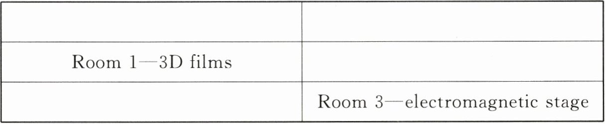 You can watch 3D films in Room 1. Room 4 is next to Room 1, and you can feel the earthquake in Room 4. Room 4 is also between Room 2 and Room 3. You can watch the science show in Room 2. There is an electromagnetic stage in Room 3. You'll have lots of fun there.