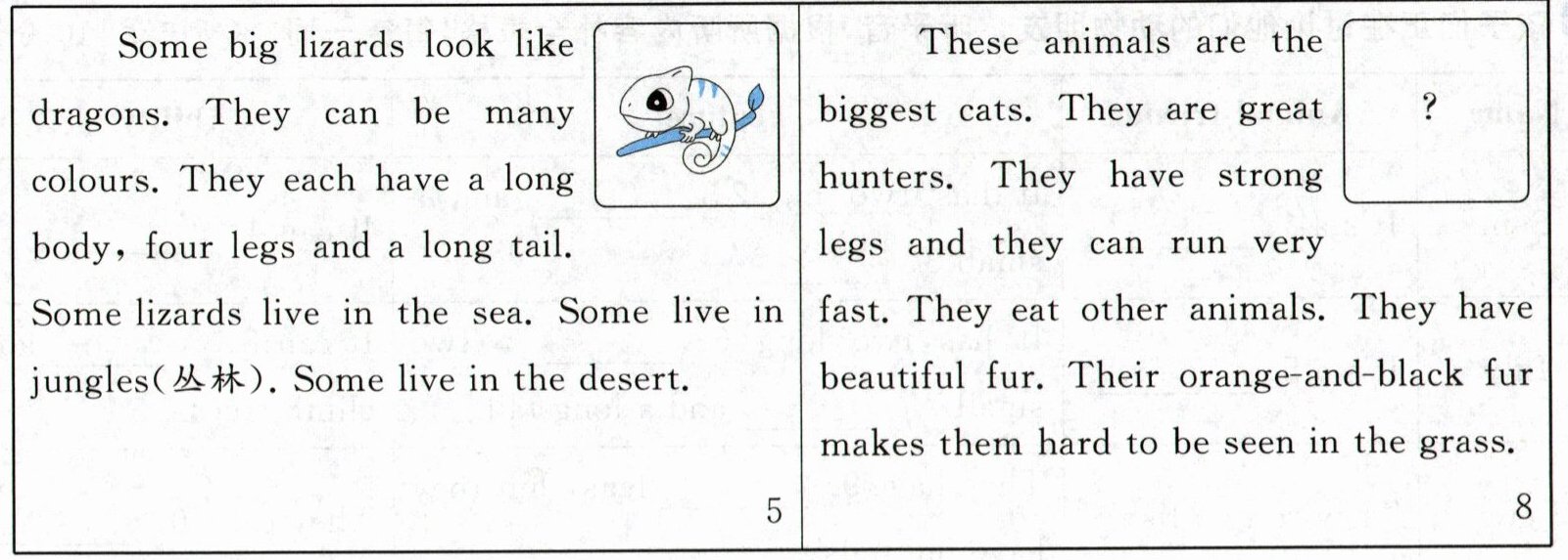 解析:根据原文“Some lizards live in the sea. Some live in jungles. Some live in the desert.”可知,一些蜥蜴生活在海里,一些生活在丛林,一些生活在沙漠。不是所有蜥蜴都生活在沙漠。故本题表述错误。