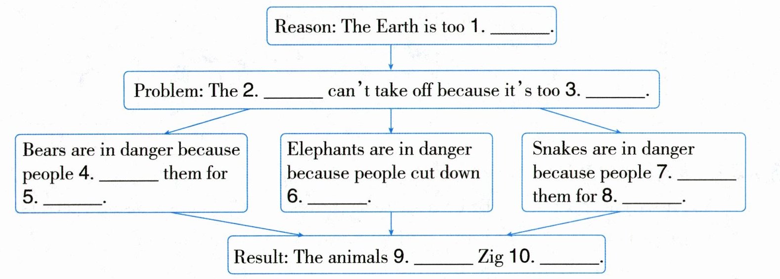 It is the year 3058. The Earth is very crowded. A man,Zig,plans to find another planet to live on. An elephant,a bear and a snake want to go with him together. However,the spaceship can't take off because it is too heavy. "Someone must get out," Zig says. "Not me. I'm in danger. People hunt bears to get their body parts. They use them in medicine," says the bear. Zig looks guiltily towards his medicine box. "Not me. People cut down the trees,so we don't have enough food to eat. I'm in danger too," says the elephant. "Don't look at me. We are in danger too. In the past, there were many snakes. But now people catch snakes. They use us to make snake soup. Some of us almost die out(灭绝)," says the snake.