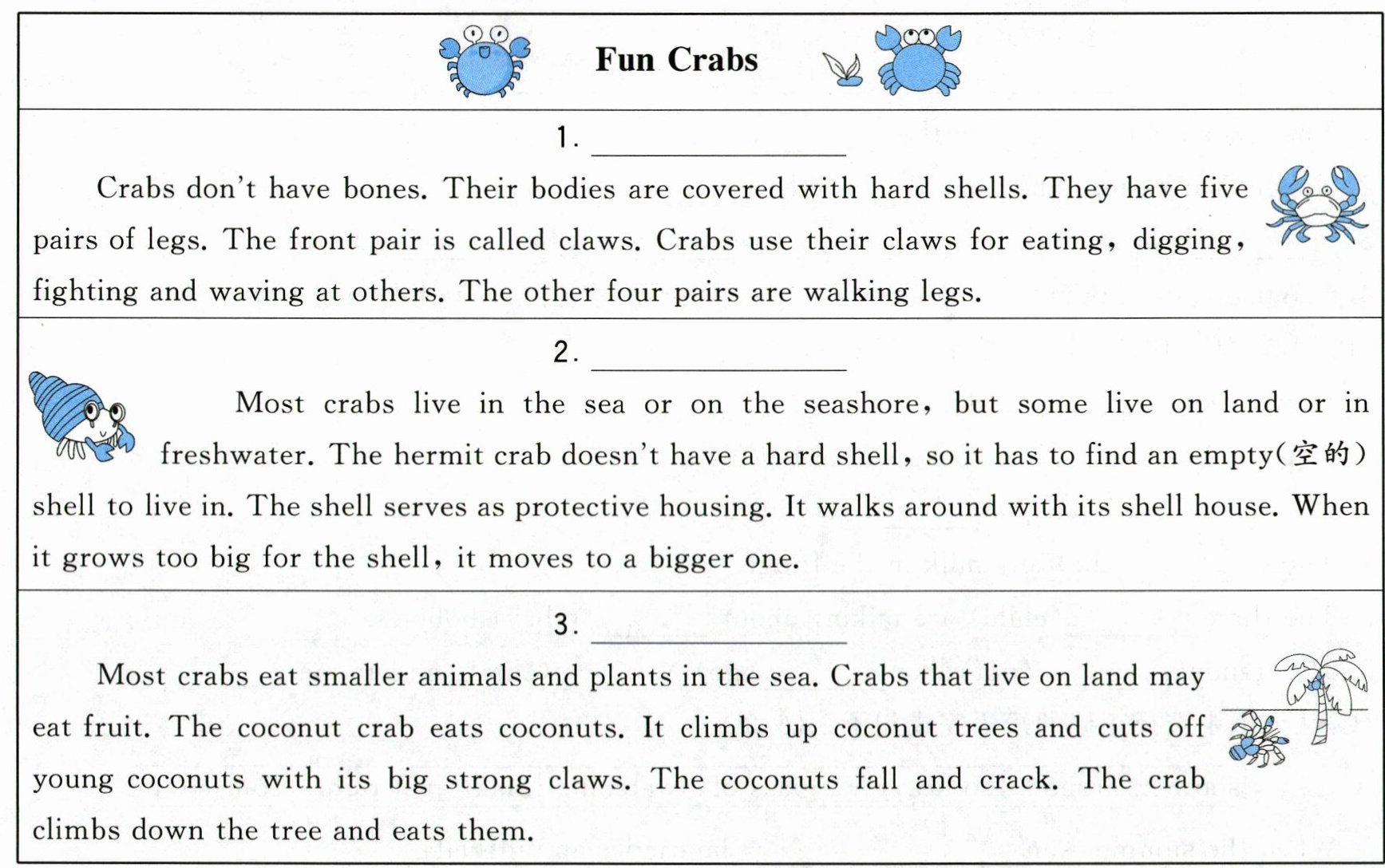 )3. Why does a hermit crab have to find an empty shell to live in?A. To keep safe. B. To collect shells. C. To look beautiful.