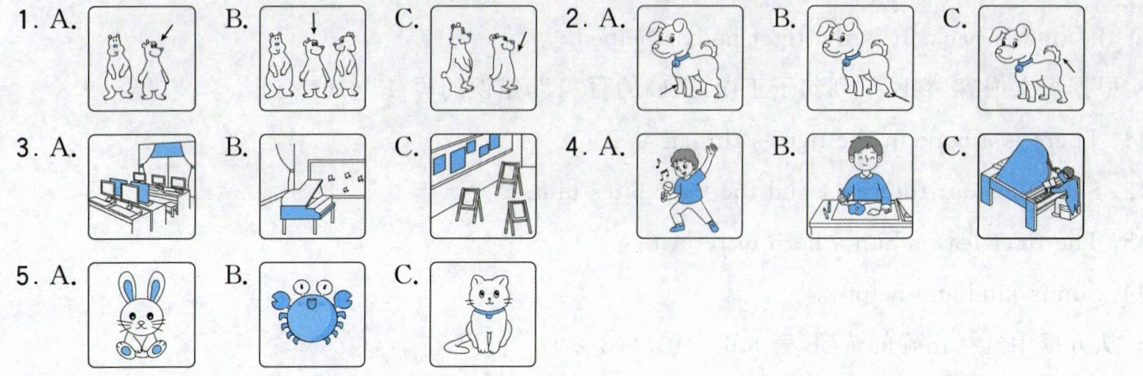 听录音,圈出与所听内容相符的图片的序号。(听两遍,5分)