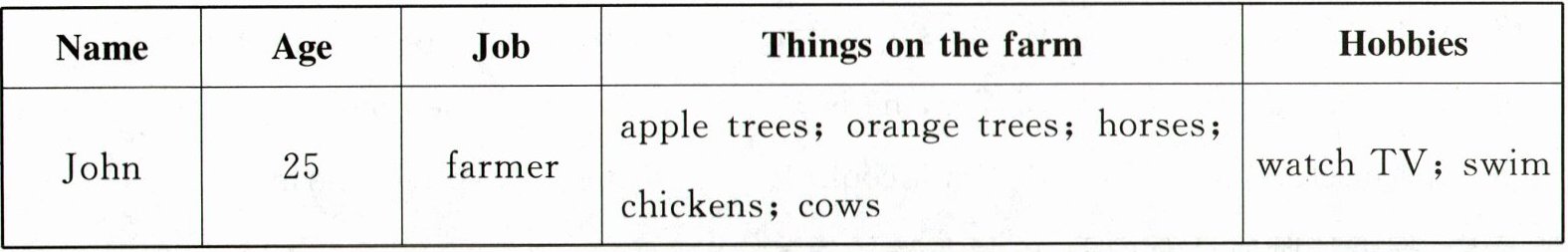 One possible version:This is my cousin. His name is John. He's 25 years old. He is a farmer. He has a big farm. There are many apple trees and orange trees on his farm. You can also see some horses,chickens and cows. He likes watching TV and swimming in his spare time.