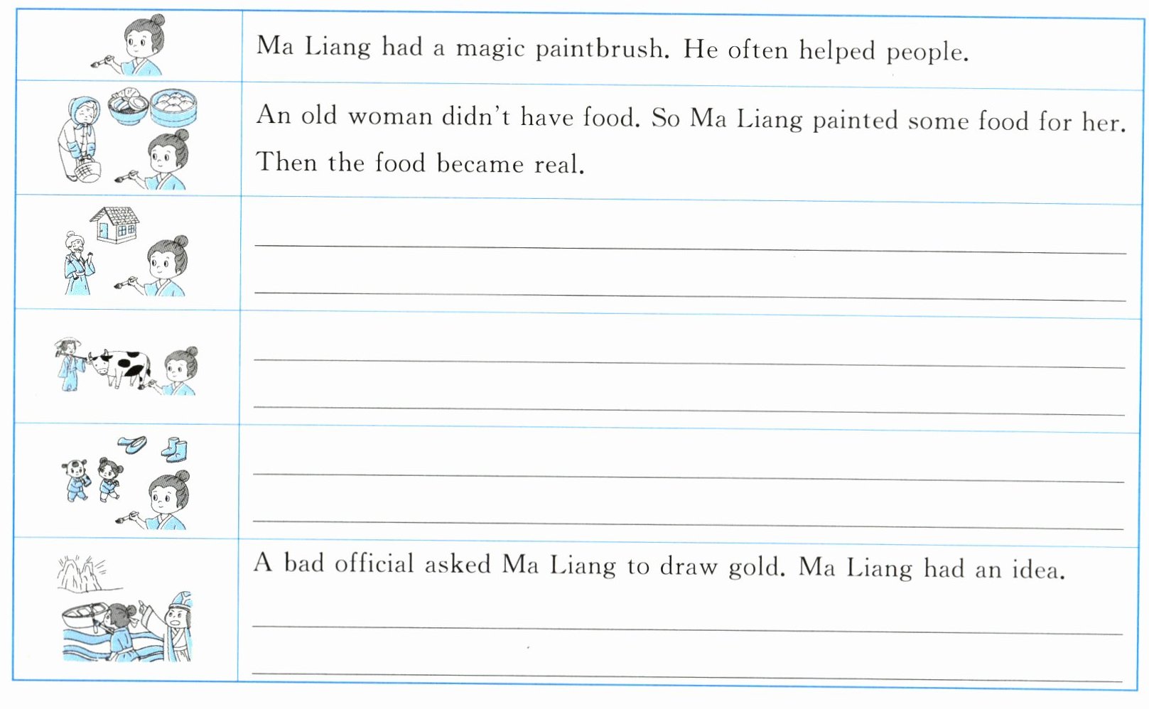 乔乔参加了学校的英语绘本创作比赛,想分享神笔马良的故事。马良用一支神笔帮助穷人,最后还凭借聪明才智赶走了坏人。请根据图片提示,帮助乔乔编写文字。