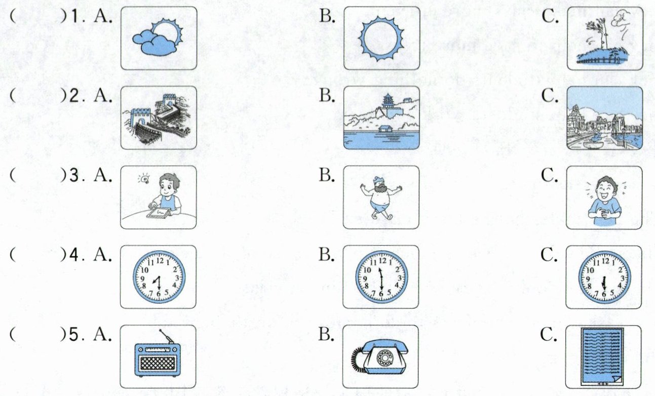 一 听录音,选出与你所听内容相符的图片。(听两遍,5分)