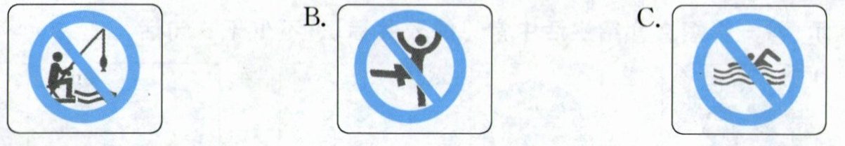 )1. A. It means we can't park here. B. It means we can't eat fish here. C. It means we shouldn't fish here.(