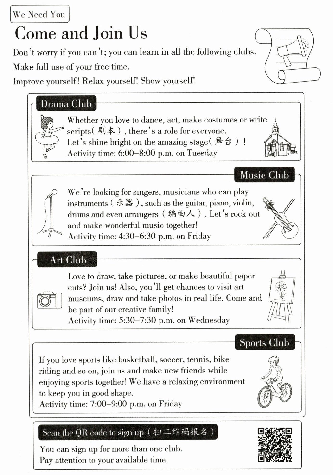26. C 细节理解题。根据Drama Club的描述,角色包含演员“Actor”,服装制作者“Costume maker”,剧本创作者“Scriptwriter”等。故选C。