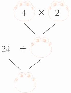 $①②④⑥\n√√√√\n[$点拨]算式中有24和4参与运算,24对应红金鱼的条数,4对应花金鱼的条数,所以先确定选择①②。又因为算式中有4×2这一步,结合条件可知④符合逻辑,故选择④。4×2 = 8(条)得到的是黑金鱼的条数,24÷8,得到的便是红金鱼的条数是黑金鱼的几倍,故选择⑥。